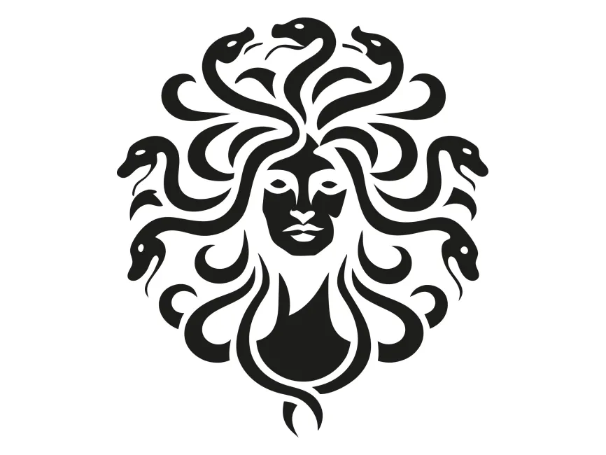This logo template features a striking depiction of Medusa, a figure from Greek mythology known for her snake-adorned hair and piercing gaze. The design utilizes a monochromatic black silhouette, creating a dramatic and powerful effect. The intricate arrangement of snakes interwoven into the figure’s hair adds a sense of movement and mystique, while the symmetry of the face establishes balance and authority.