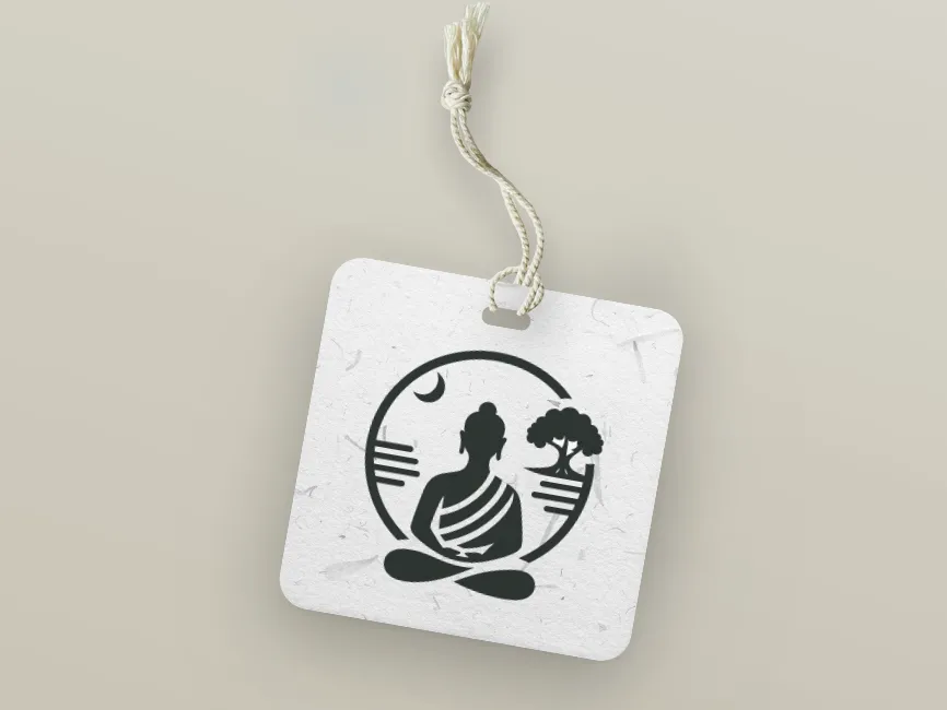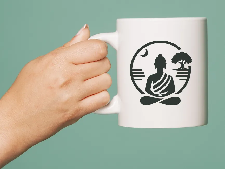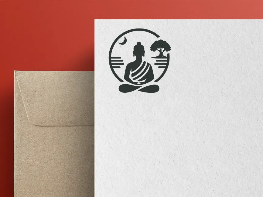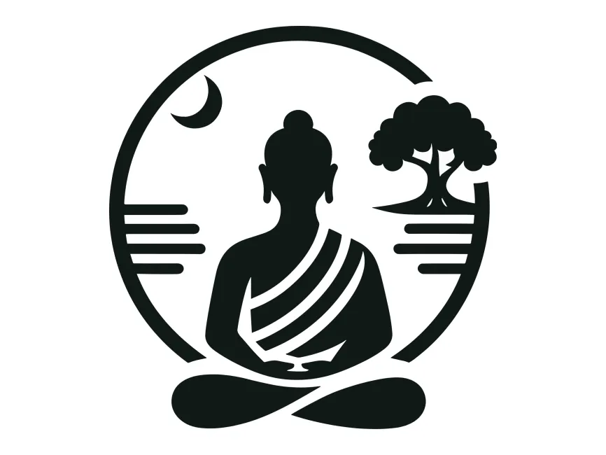 This minimalist vector design captures the essence of peaceful introspection through the silhouette of a seated Buddha framed by a partial circular border. Balanced by a crescent moon on the left and a tree on the right, the design merges spiritual calm with natural harmony. Its clean lines and bold black style make it highly versatile for wellness branding, yoga studios, meditation platforms, and spiritual product packaging.