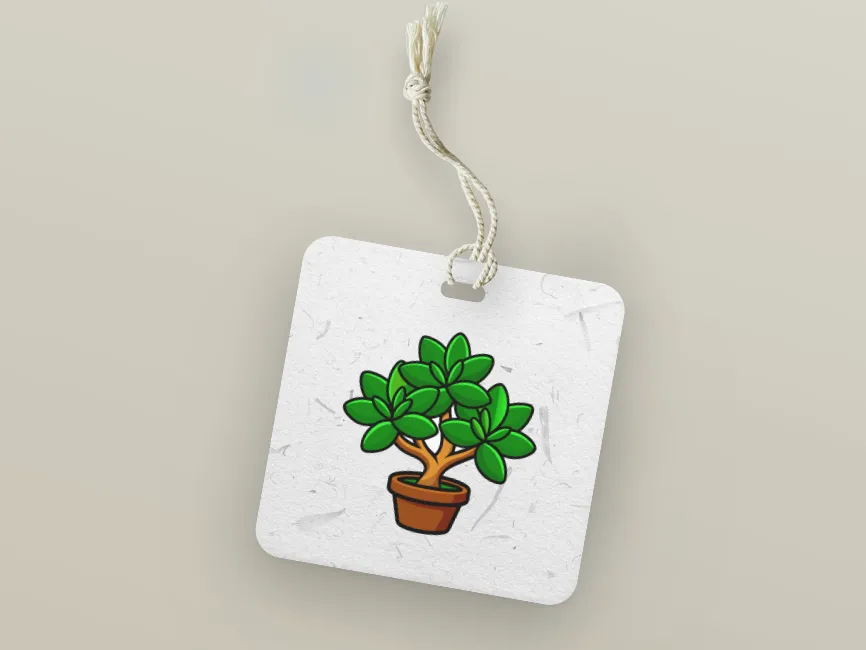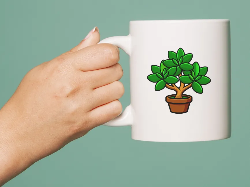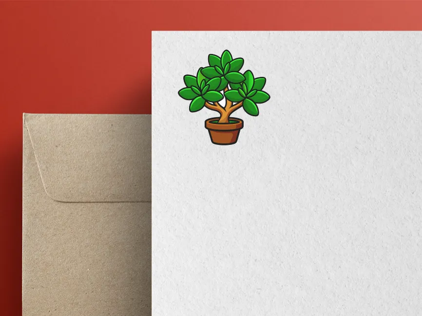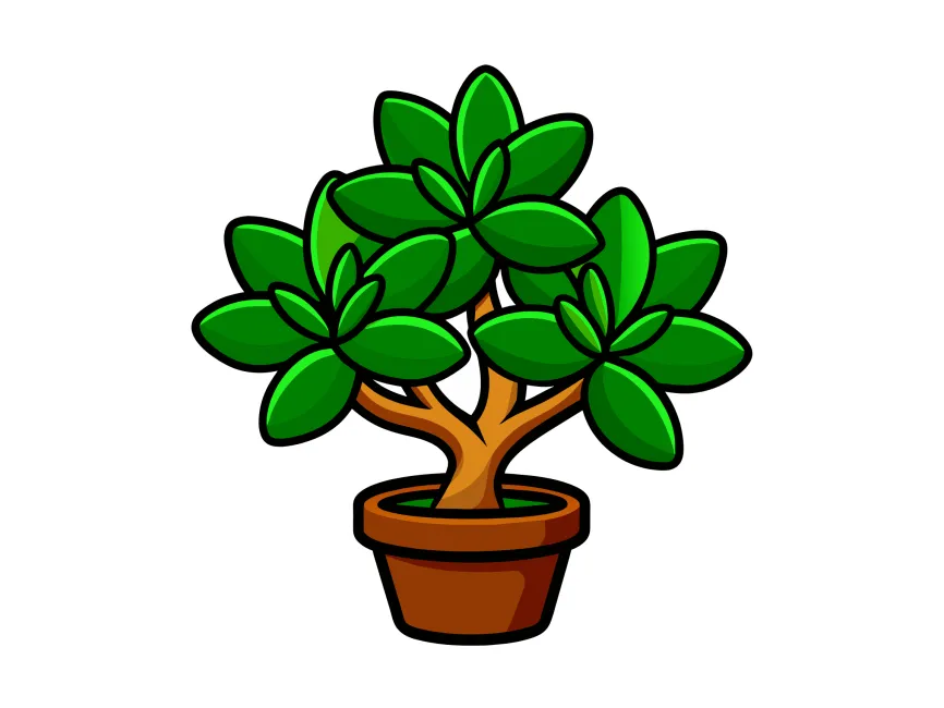 This vector illustration features a stylized jade plant (Crassula ovata) in a terracotta pot. The plant’s thick, fleshy green leaves are arranged symmetrically, with a secondary layer of smaller leaves growing from the center. The sturdy brown trunk has a natural, curved shape, giving the plant a structured yet organic look. The bold black outlines and shading give this design a cartoon-like, modern aesthetic, making it stand out for digital and print applications.