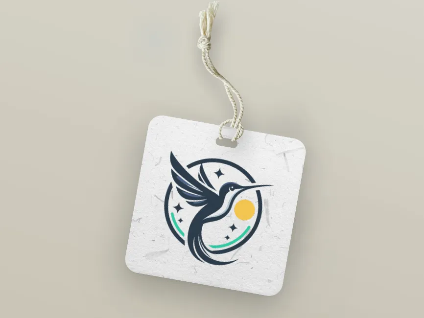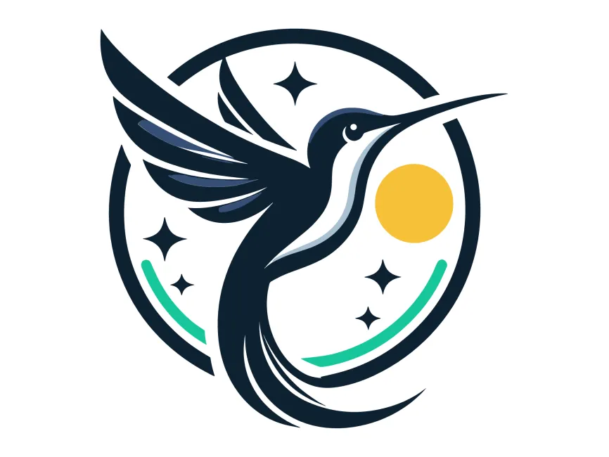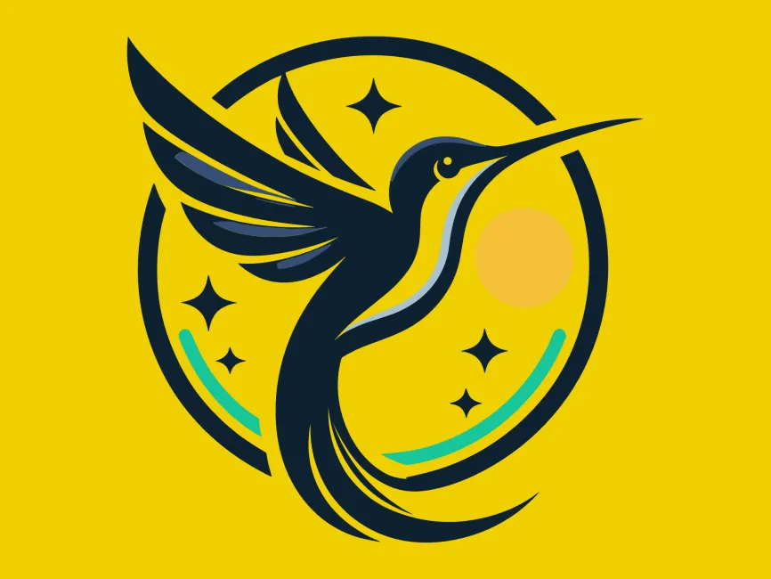 This is a symbolic vector logo that integrates geometric shapes with organic curves. The hummingbird is rendered in navy blue tones, highlighted with soft gradients of white and mint green, giving it a clean, modern finish. The yellow circle represents light or a sun, reinforcing themes of vitality and life. Sparkling stars add a celestial flair, perfect for visionary and aspirational brand identities.