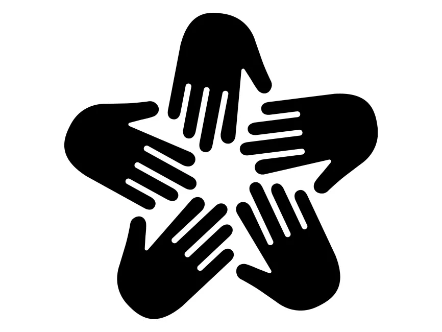 - Shape & Structure: The symmetrical arrangement of five hands forms a balanced circular composition, reinforcing ideas of cooperation and inclusivity.