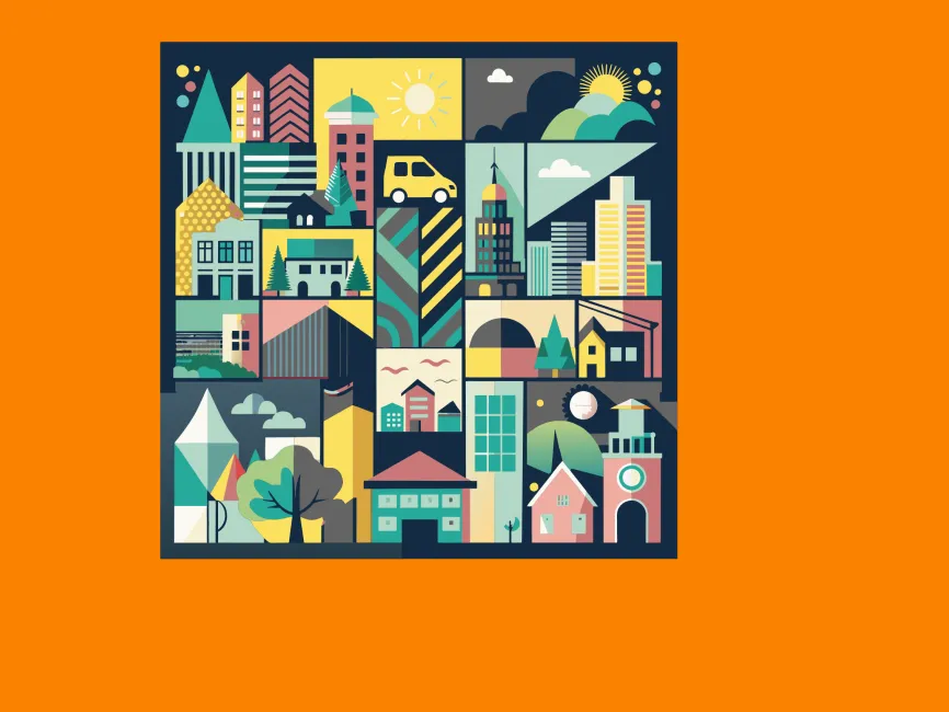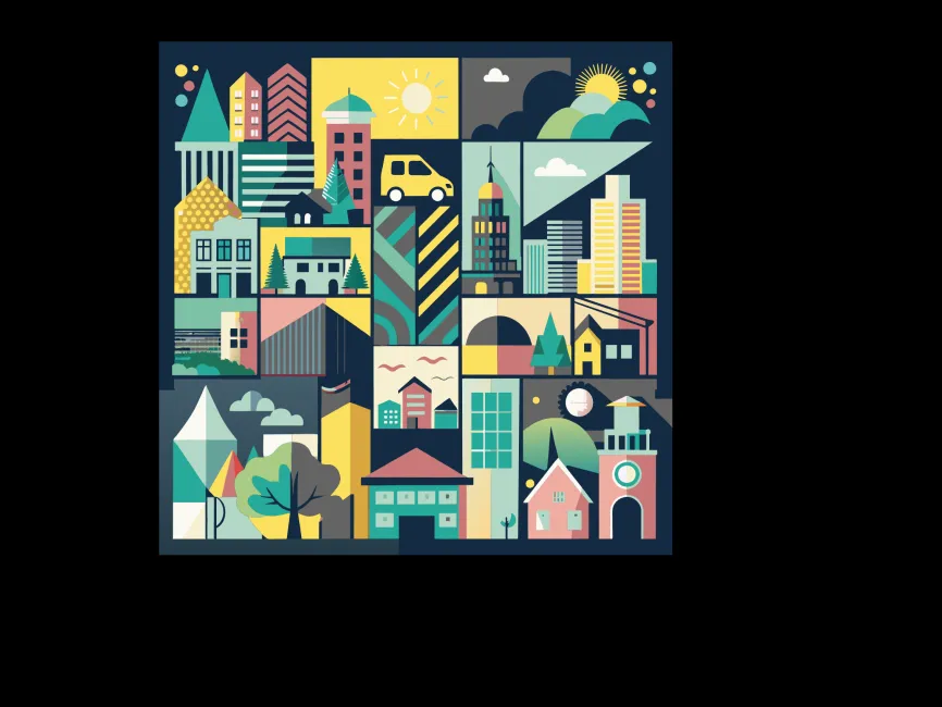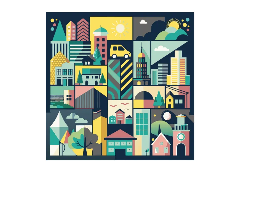 This illustration is a vibrant and artistic representation of a cityscape, composed of multiple geometric shapes and stylized architectural elements. The composition includes various buildings, houses, skyscrapers, a church, and natural elements like trees, clouds, and the sun, all arranged in a grid-like structure. The use of bold colors such as teal, yellow, pink, and dark blue creates a visually striking effect.