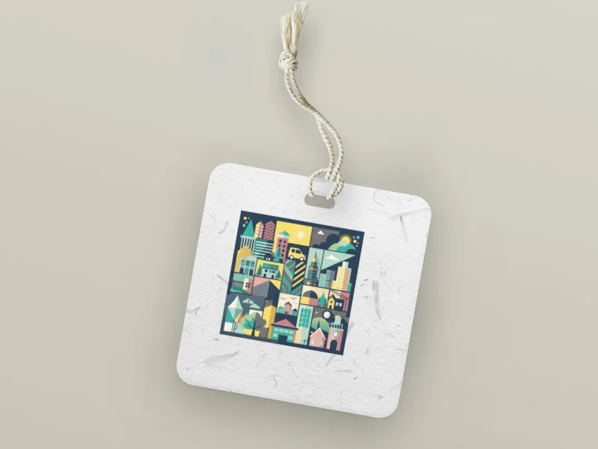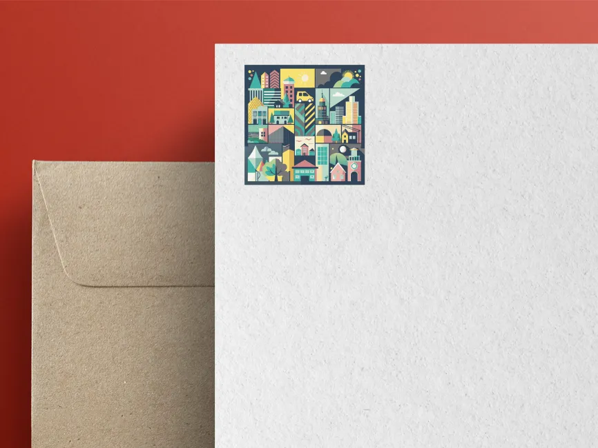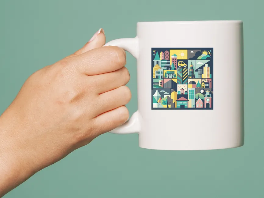 The illustration features a modern and abstract art style, with a touch of cubism, as different sections of the city are fragmented into distinct rectangular and square sections. This structured arrangement gives it a mosaic-like appearance, enhancing its aesthetic appeal. The addition of details like a car, clock, and bridge brings a dynamic urban feel to the composition.