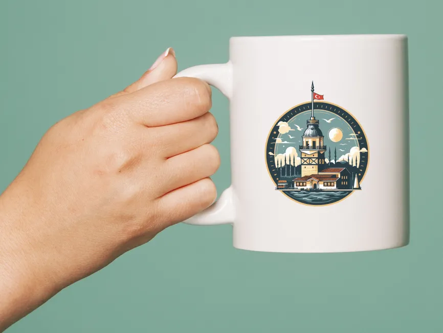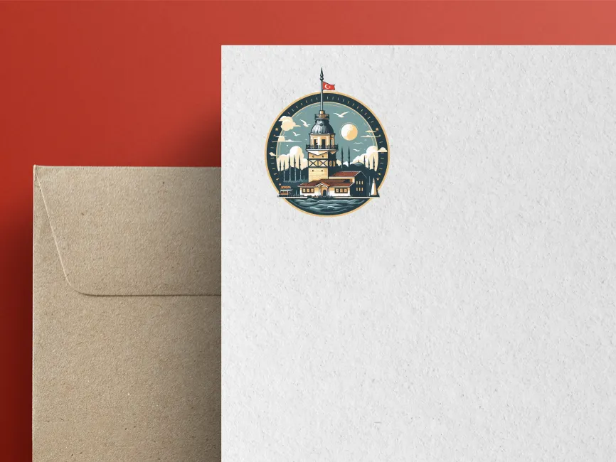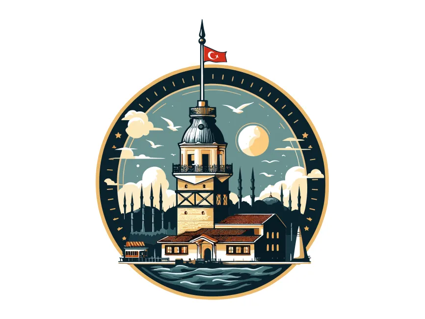 This logo template is a beautifully detailed and vibrant illustration of the Maiden’s Tower (Kız Kulesi) in Istanbul. The design features a rich color palette, including warm tones for the tower’s structure, deep blues for the water, and golden accents for the sky and sun, creating a visually stunning and nostalgic composition. The Turkish flag at the top enhances its national and cultural identity, while the circular frame adds a classic and emblematic look.
