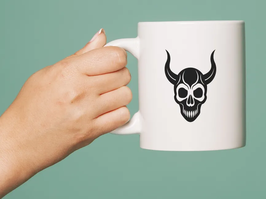 This logo template features a minimalist and high-impact design of a demonic skull with large, upward-curving horns and a sharply stylized skeletal face. It’s crafted entirely in black and white vector format, emphasizing symmetry and contrast. The hollow eyes, sharp teeth, and curved horn structure contribute to a visually aggressive and mysterious look — ideal for alternative and subcultural branding.