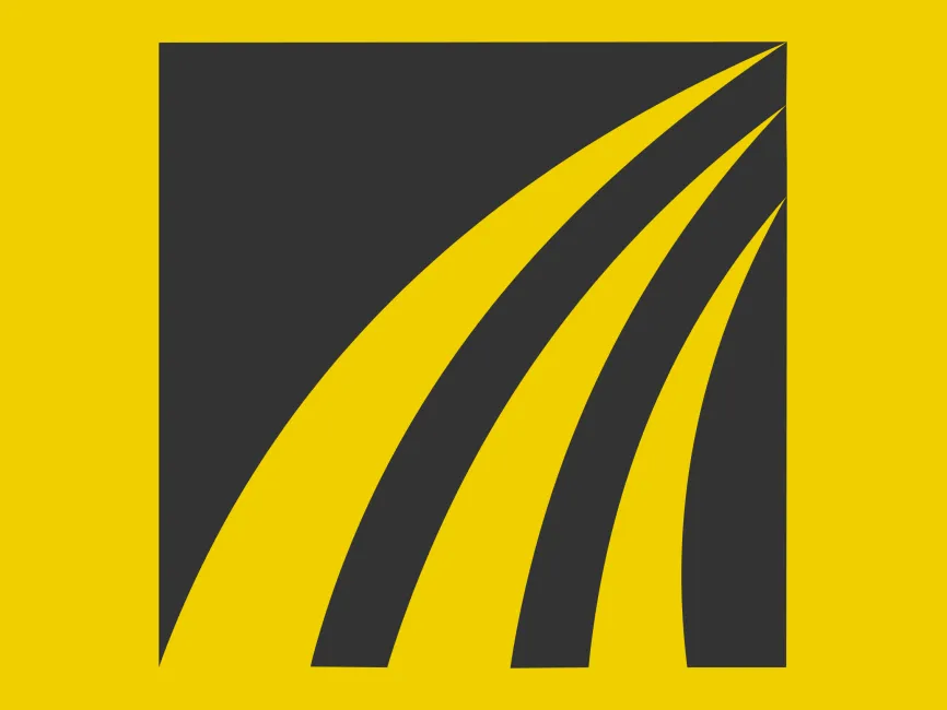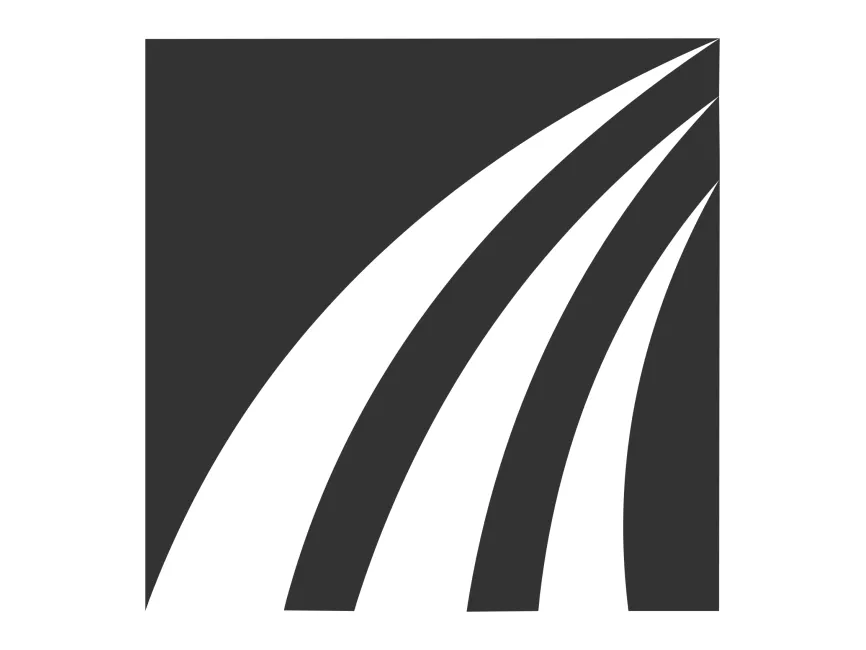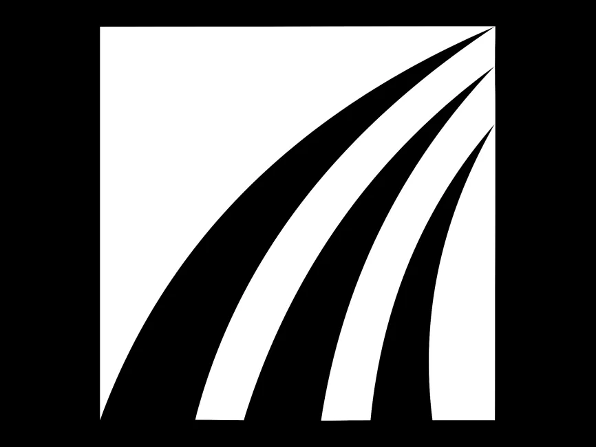 This shape is structured within a square frame, offering a well-balanced and stable foundation. The curved, sweeping lines originate from the lower left corner and extend outward toward the upper right, resembling a highway, wind currents, or data waves. The contrast between the thick black fills and white negative spaces enhances the sense of movement and direction.