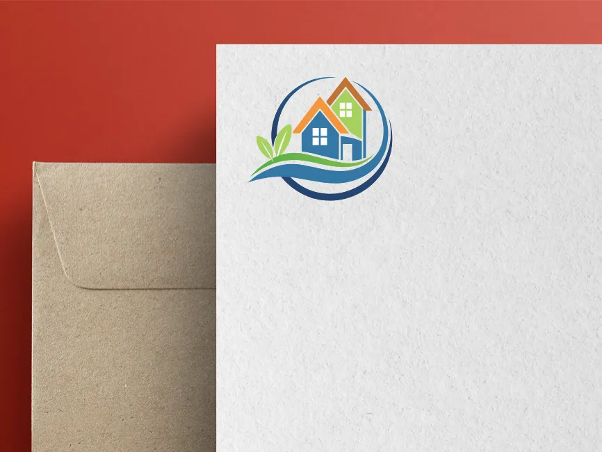 This modern real estate logo combines elements of sustainable housing, nature, and urban development, making it ideal for eco-conscious real estate agencies, green housing projects, and property developers. The dual-house structure represents residential real estate, while the flowing curves and leaf accents emphasize sustainability and environmental responsibility. The circular frame adds a sense of unity, global reach, and community focus.