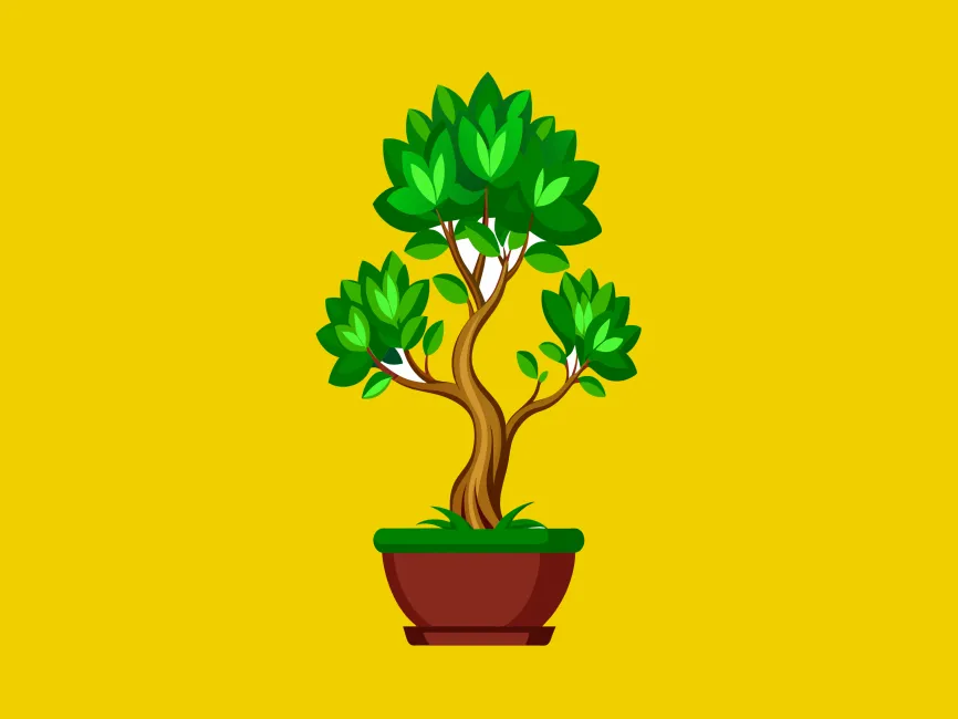 This bonsai tree vector design features a gracefully curved woody trunk with multiple branches adorned with lush green leaves. The rich brown pot with a smooth rounded shape provides a strong base, complementing the natural, artistic flow of the tree. The leaves exhibit varying shades of vibrant green, adding depth and a sense of liveliness to the illustration.