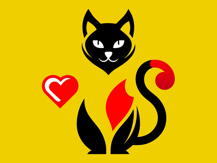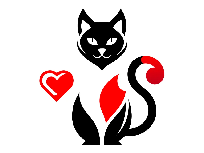 The cat’s tail forms an artistic spiral, while the body integrates leaf-like elements, emphasizing fluidity and motion. The red heart on the left complements the overall theme, suggesting affection, warmth, and connection. The color contrast between black and red enhances visual impact, making this shape ideal for branding in pet-related businesses, fashion, and creative industries.