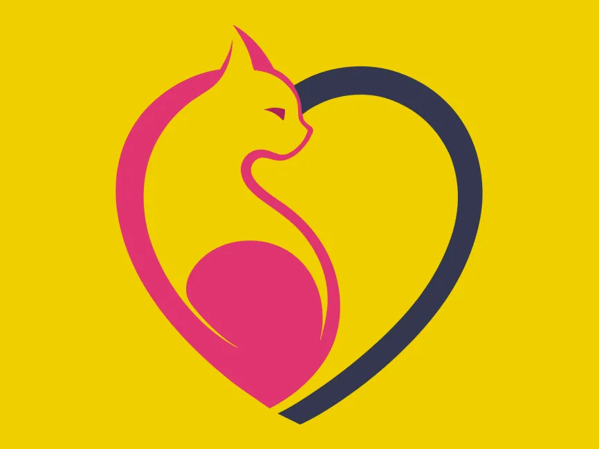 This logo template features a beautifully stylized cat and dog illustration seamlessly integrated into a heart shape. The design utilizes negative space effectively, with the cat in pink and the dog in dark navy blue. The curved lines create a soft and elegant aesthetic, emphasizing care, love, and companionship.