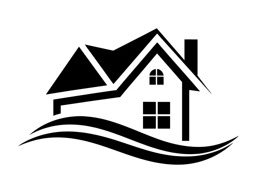 This black and white real estate logo features a modern house silhouette with a dynamic wave-like base, creating a stylish and professional look. The bold rooftop structure symbolizes security and homeownership, while the flowing lines below suggest movement, flexibility, and a connection to nature—ideal for businesses related to real estate, home improvement, and property management.