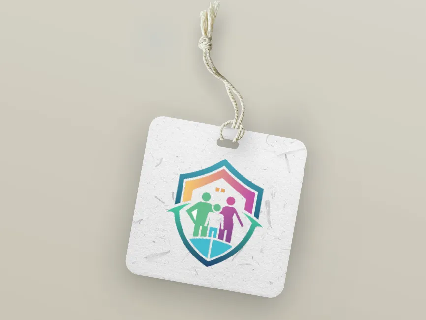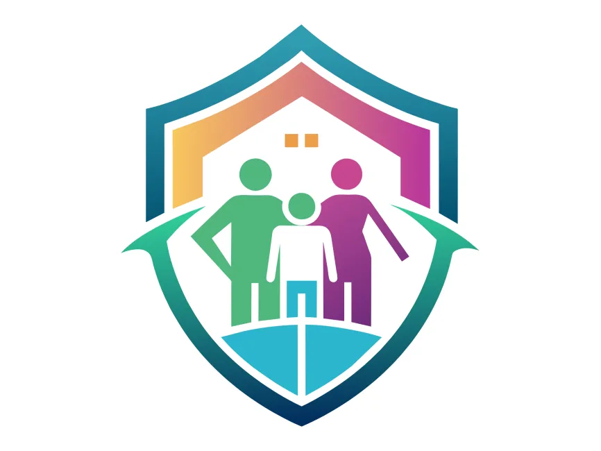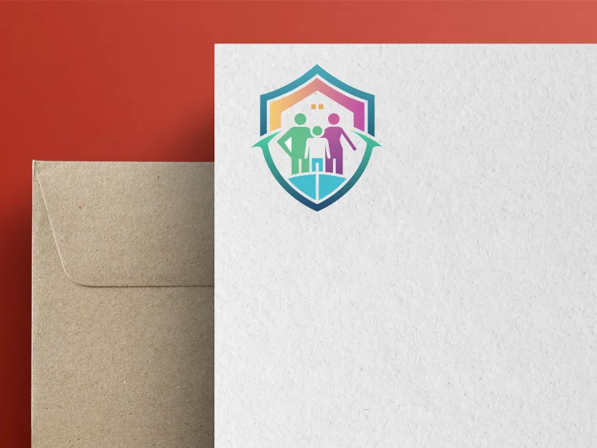 This logo template represents family security, home protection, and community well-being. The design features a shield shape, symbolizing safety and trust, enclosing a house with a family inside, emphasizing care, unity, and protection. The gradient colors and eco-friendly elements make this a versatile vector logo for businesses related to insurance, real estate, and family support services.