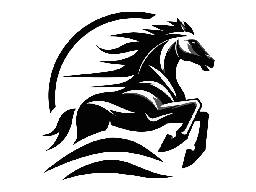 The overall shape leans forward, conveying drive and ambition. The three lower stripes represent motion trails, dust, or energy waves—perfectly complementing the leaping posture of the horse.