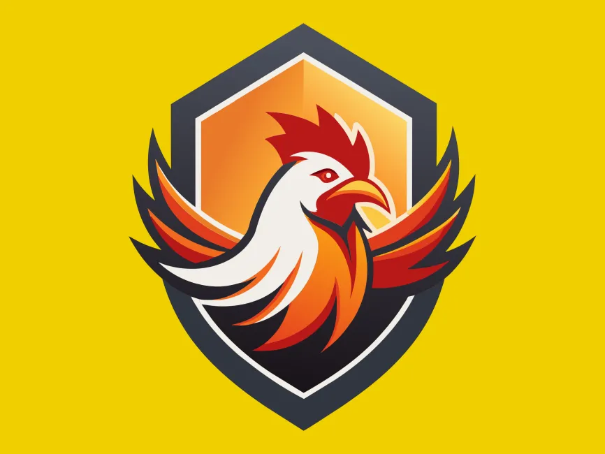 his bold and dynamic rooster logo features an aggressive, fiery design enclosed within a strong shield emblem. The rooster's wings are spread wide, symbolizing power, dominance, and victory. The hexagonal background with a gradient of warm oranges and yellows reinforces the idea of strength, energy, and dawn, while the dark shield creates a bold contrast, making the logo highly impactful and authoritative.