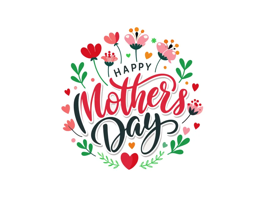 This stunning Mother's Day vector illustration features an artistic hand-lettered "Happy Mother's Day" text, encircled by a vibrant floral arrangement. The combination of bold script, delicate botanical elements, and charming heart accents creates a warm and festive aesthetic, ideal for celebrating this special occasion.