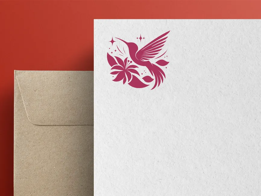 The hummingbird is illustrated with fine lines and smooth curves, emphasizing delicacy and movement. The accompanying flower and decorative elements give it a balanced and complete logo structure that feels alive and vibrant.