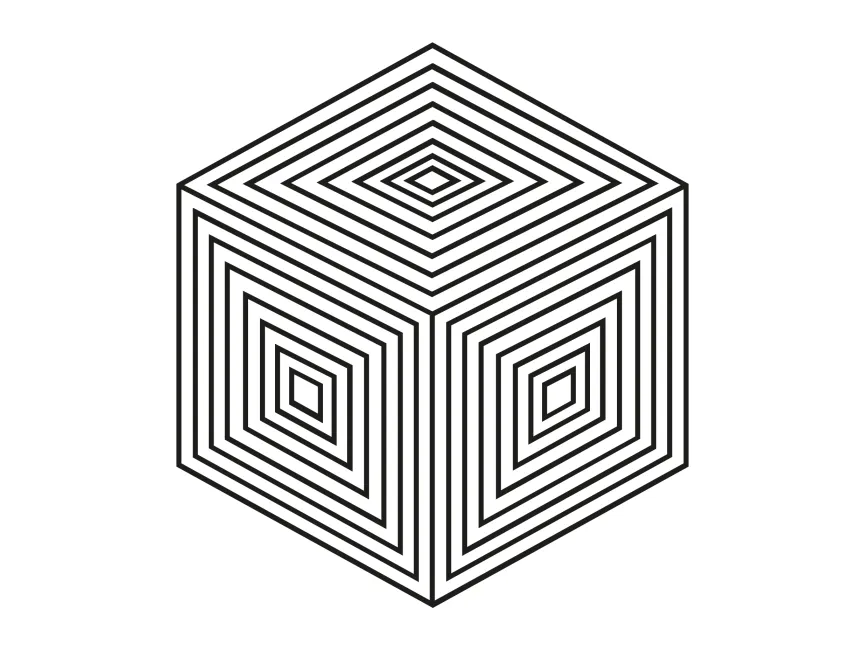 This intricate optical illusion cube is composed of concentric diamond-shaped layers that create a 3D perspective effect. The symmetrical and precise line work enhances depth, making it a modern, futuristic, and visually engaging design element.