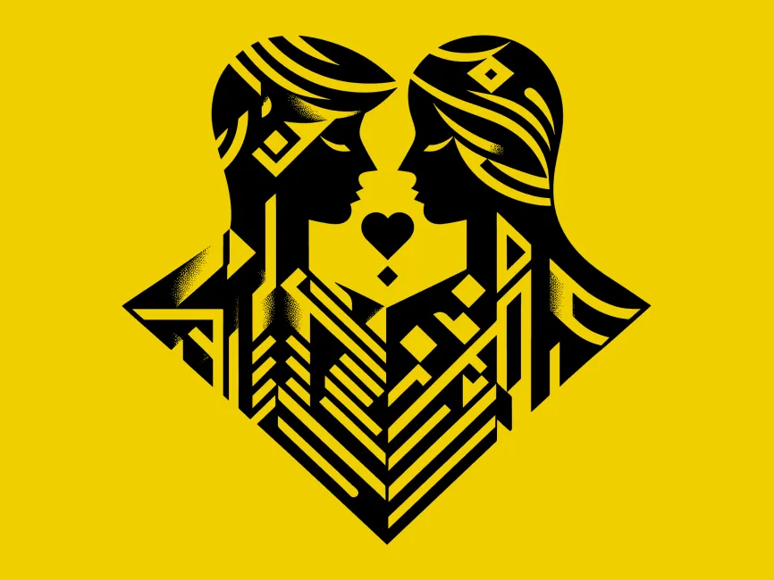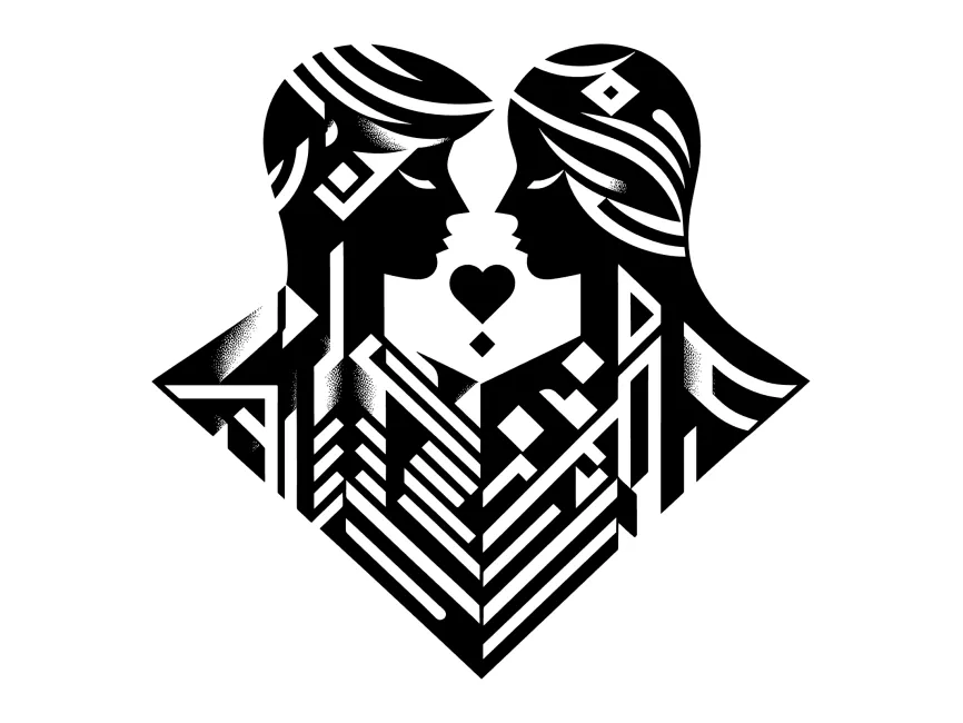 This black-and-white geometric vector illustration features a man and woman facing each other, their profiles forming a structured and abstract heart shape. The design incorporates sharp lines, diamond patterns, and modern ornamental elements, creating a futuristic yet romantic visual effect. A small heart floats between them, symbolizing love, unity, and deep emotional connection.