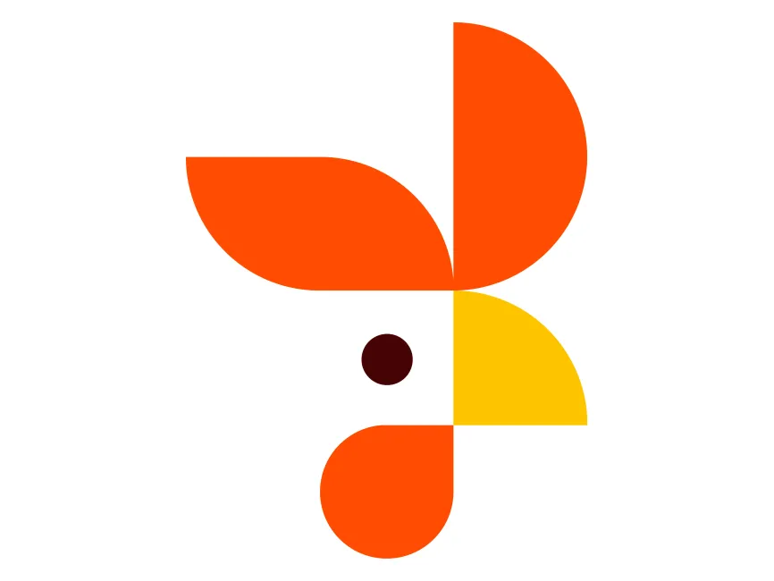 This geometric logo design features a stylized rooster head, created using bold, abstract shapes in a modern and minimalistic approach. The combination of semicircles and quarter circles in vibrant orange, yellow, and deep red tones effectively forms the rooster's beak, comb, and eye, making it an ideal emblem for brands seeking a creative and contemporary identity.