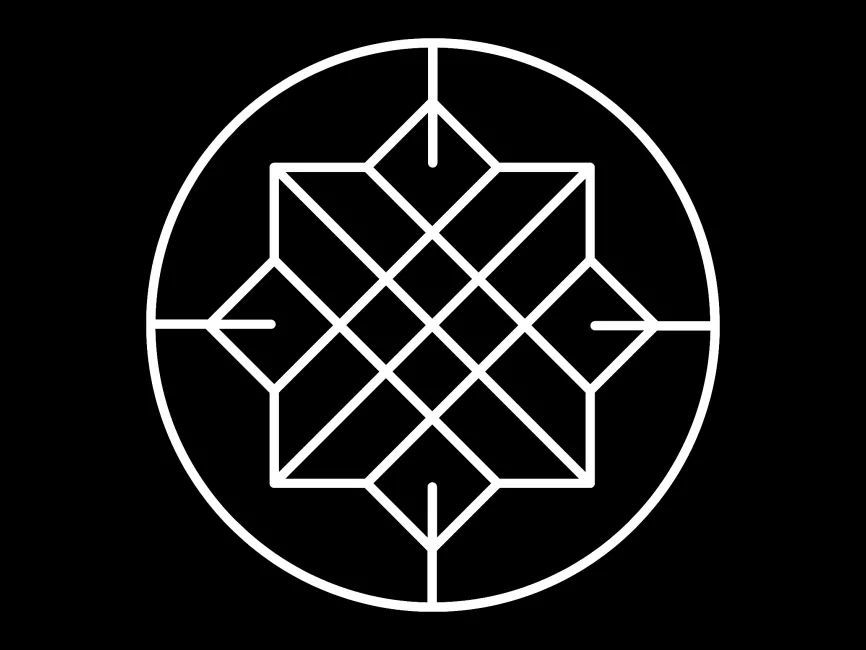 This emblem strongly evokes sacred geometry, with its intersecting diamonds symbolizing structure, balance, and harmony. The use of a central grid within a circle can also represent: