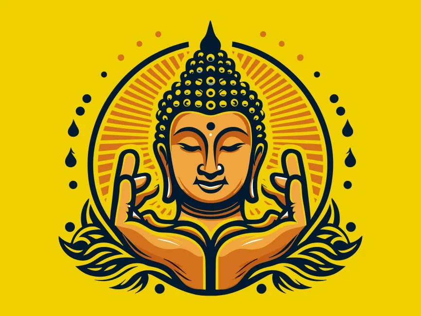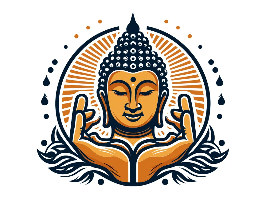 This vector design is a striking depiction of the Buddha's serene face cradled within a pair of open, protective hands, surrounded by a radiant sunburst and symbolic water or flame-like accents. With its vivid golden-orange palette, symmetrical composition, and spiritual depth, this design is ideal for wellness branding, holistic healing services, yoga studio visuals, and conscious product packaging.