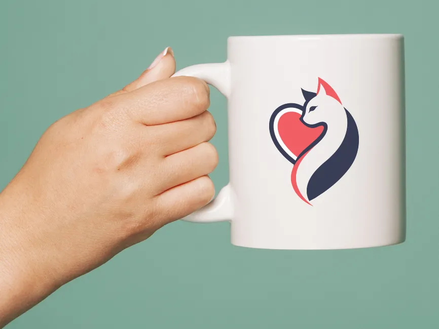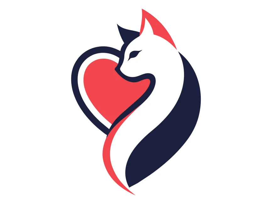 This modern feline logo beautifully integrates a stylized cat silhouette with a heart shape, symbolizing love, elegance, and companionship. The fluid curves and contrasting navy blue and coral red color scheme create a visually appealing and sophisticated design.