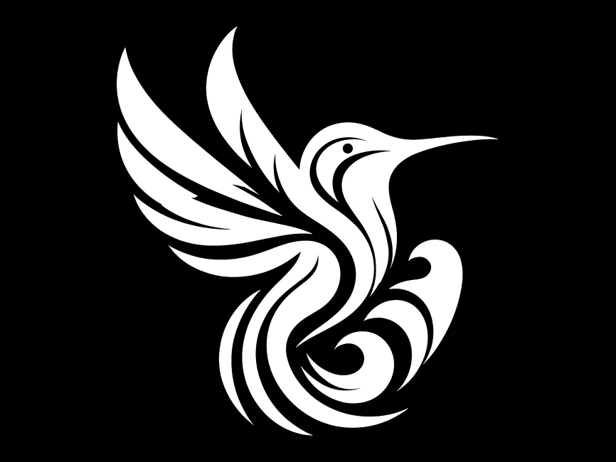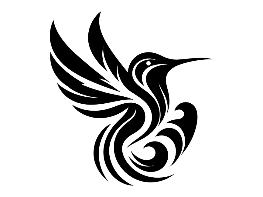 This vector design captures the essence of a hummingbird in flight, stylized with flowing tribal line work and abstract geometry. With its dynamic curves and bold black silhouette, it stands out as a powerful, elegant, and highly recognizable form ideal for branding, tattoos, or decorative uses. The sharp beak, detailed wing structure, and spiraling tail feathers all align to express both motion and serenity.