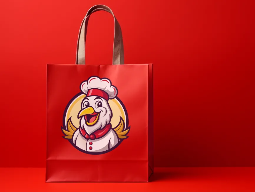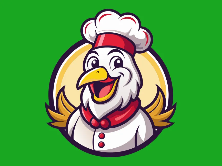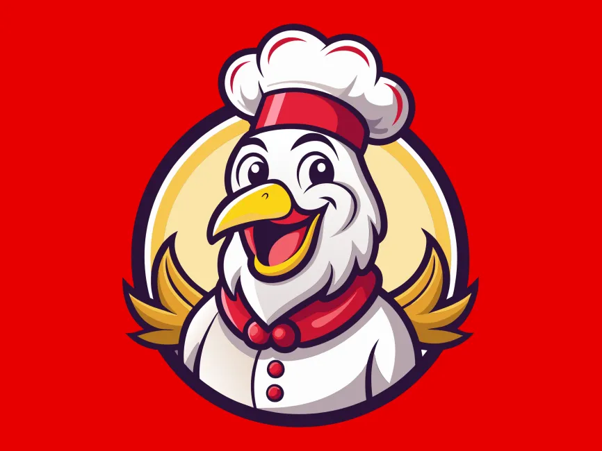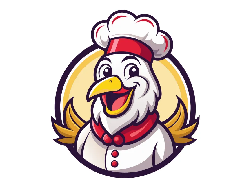 This logo template features a cheerful, cartoon-style chicken dressed as a chef, making it an ideal branding choice for food-related businesses. The design captures a fun and inviting personality, with the chicken wearing a traditional white chef’s hat, a red bandana, and a uniform with button details. The circular frame and golden feather accents enhance its dynamic appeal, creating a professional yet playful identity.