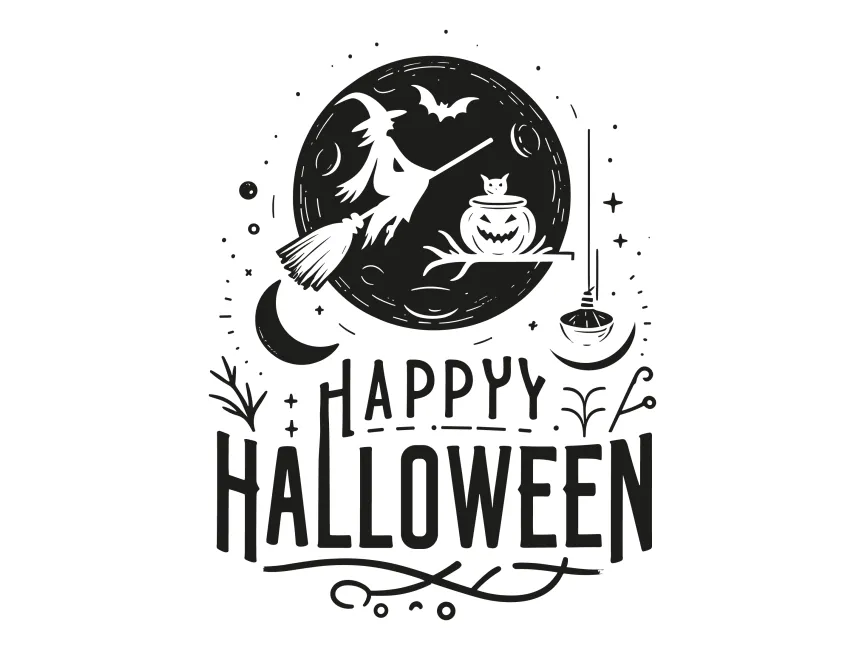 Download Happy Halloween Lettering with Witch Flying on a Broomstick PDF vector and SVG logo Vector Format and PNG Transparent Format, Adobe Illustrator Ai format, EPS Format.