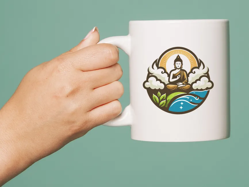 From a geometric perspective, the design is rooted in circular symmetry with organic curves. The clouds, leaves, and waves are arranged in layers that wrap around the meditating figure, guiding the viewer’s eye in a soft spiral motion that feels peaceful and complete. The clean outlines and clear separation of elements also ensure scalability across various formats.