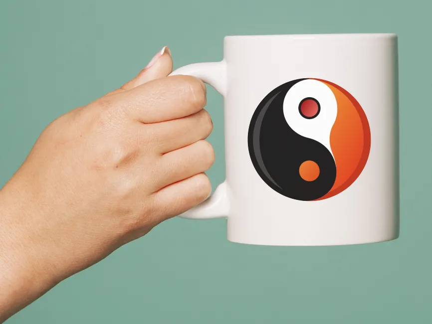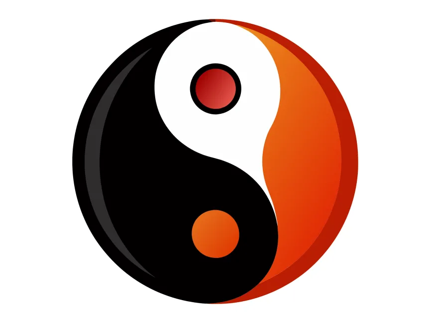 The circular form remains intact, symbolizing wholeness and infinite continuity. The two teardrop shapes are perfectly balanced within the circle, each holding a contrasting dot within it, staying true to the fundamental "Yin within Yang, Yang within Yin" concept. The use of warm colors like red and orange intensifies the feeling of energy and passion, while the black anchors it with strength and seriousness.