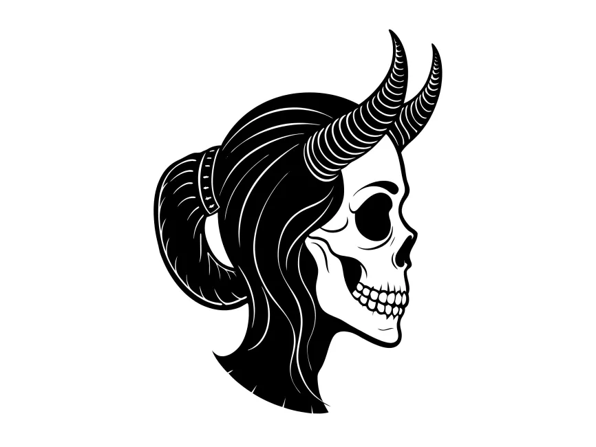 This logo template features a unique and powerful female skull with horns, designed in a clean, black-and-white vector style. The side-profile composition showcases flowing hair tied back in a ponytail, paired with two prominent upward-curving demon horns. This fusion of femininity and darkness gives the logo a balance of elegance, mystery, and rebellion.