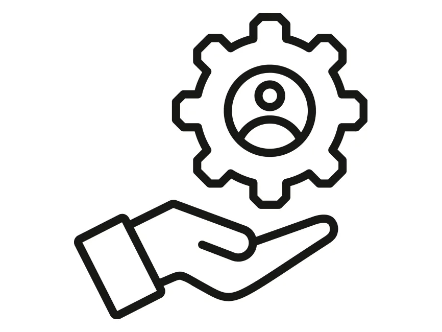 This icon represents Human Resource Management (HRM) and Business Support Services. The design consists of an open hand, symbolizing support, assistance, and management, while a gear with a user profile inside illustrates workforce management, settings, and employee-related processes. The combination of these elements suggests concepts such as HR services, employee management, workforce solutions, and business operations.