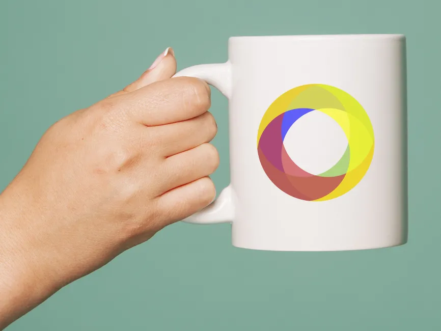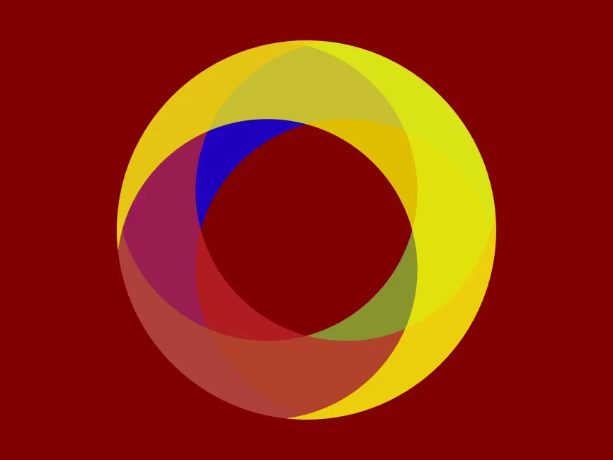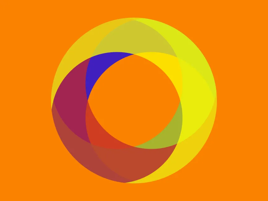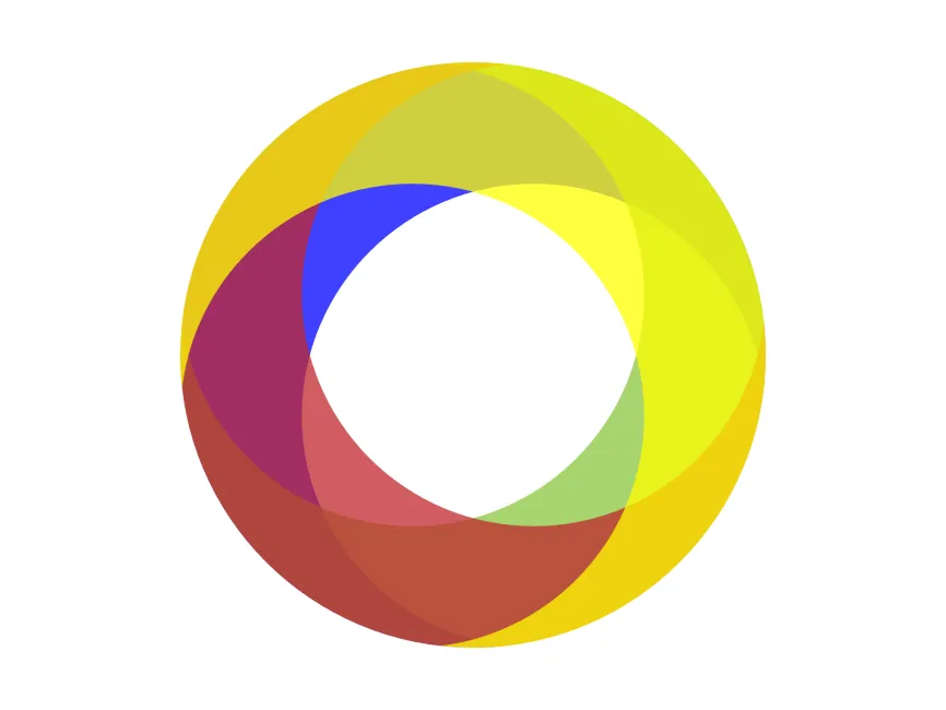 The semi-transparent overlapping arcs create a color-mixing effect, symbolizing integration and diversity. The combination of yellow, blue, maroon, and red represents creativity, trust, energy, and warmth.