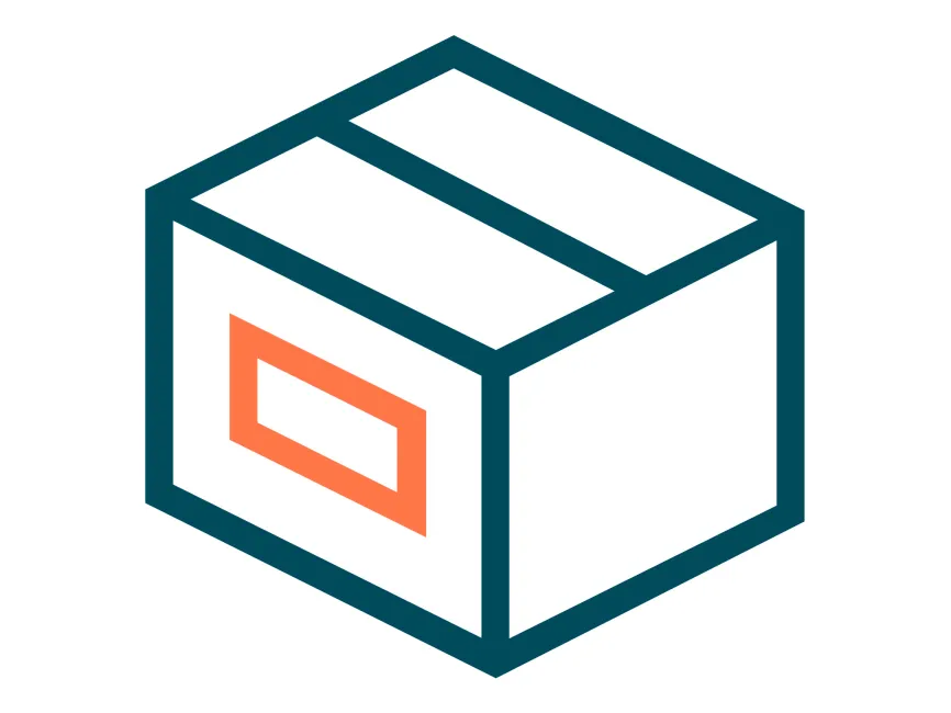 Constructed with bold outlines in deep teal and a single contrasting orange label, this icon captures attention while maintaining a clean, professional look. The top-facing box flaps and visible corners emphasize its depth, giving it a dimensional quality that works exceptionally well in flat design systems.