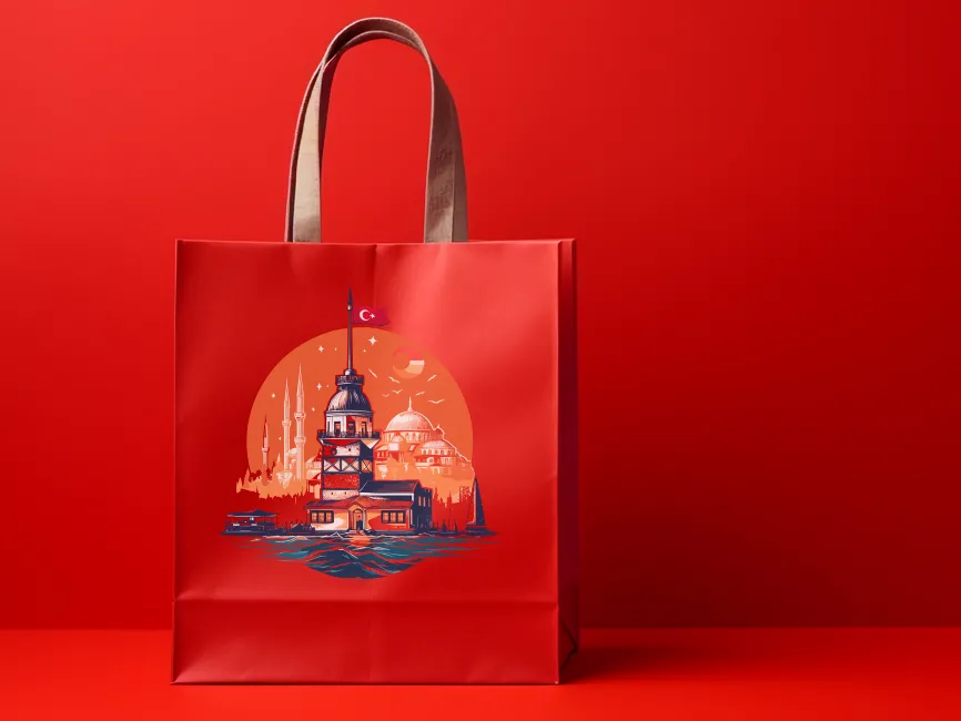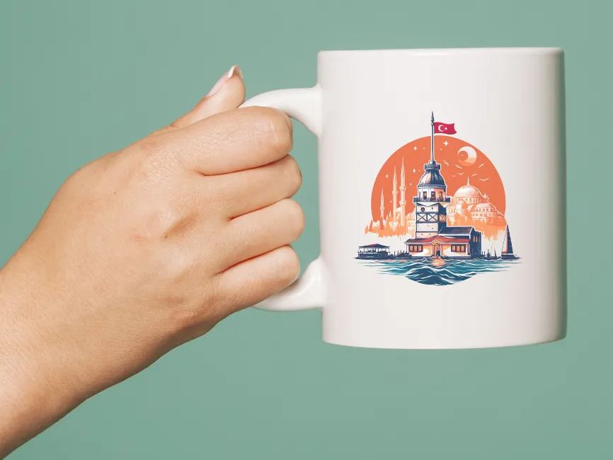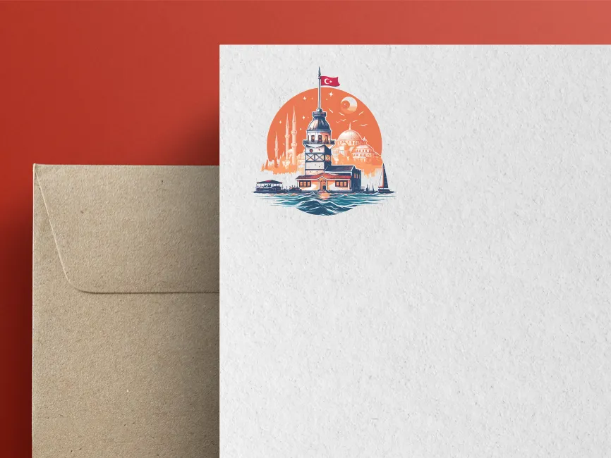 The logo is crafted in a semi-realistic digital painting style, featuring warm tones of orange, red, and blue, which beautifully contrast the architectural elements and the sea. The circular composition frames the scene, enhancing visual balance. The Turkish flag at the top adds a patriotic touch, reinforcing national pride and identity. The detailed water reflection and subtle night sky elements create depth and an immersive atmosphere.
