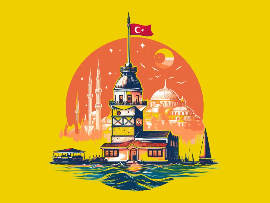This logo template showcases a vibrant and detailed illustration of the Maiden's Tower (Kız Kulesi), set against a stunning backdrop of Istanbul’s skyline, including the Hagia Sophia and Blue Mosque. The design captures the essence of Turkish heritage with a warm, rich color palette, making it an eye-catching choice for brands looking to emphasize culture, history, and tourism.