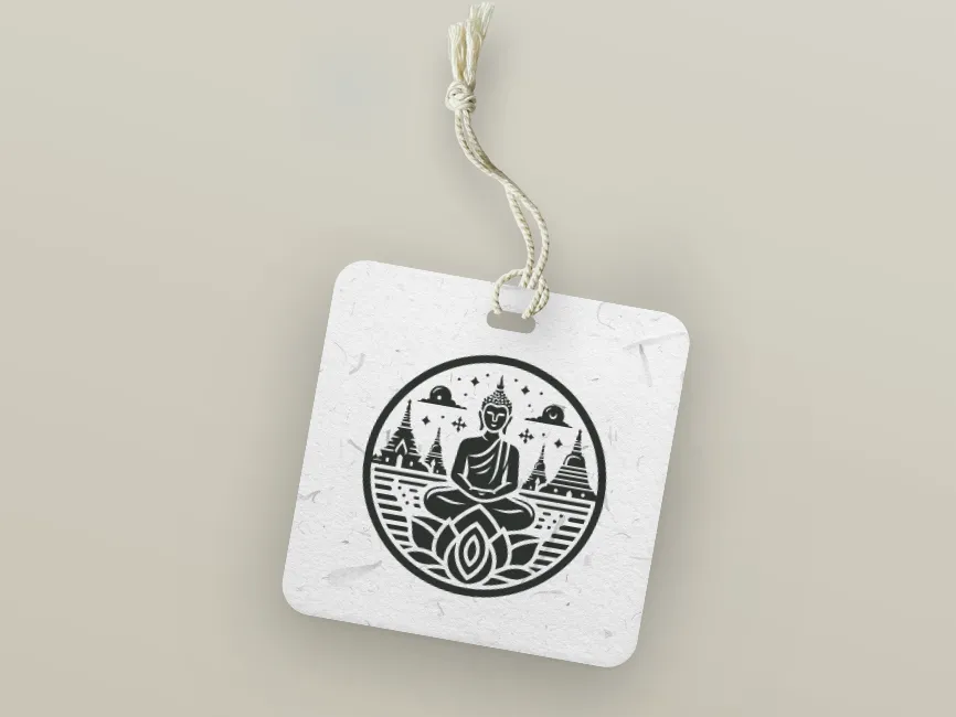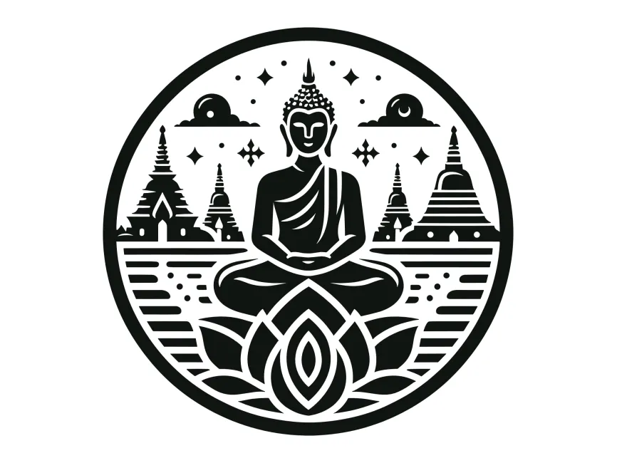 The architectural elements in the background, resembling traditional Southeast Asian stupas and pagodas, ground the design in cultural authenticity. Stars, clouds, and celestial orbs add a spiritual atmosphere and elevate the visual storytelling. These features make this design particularly powerful in branding or art that aims to convey deep reflection, enlightenment, and timeless peace.