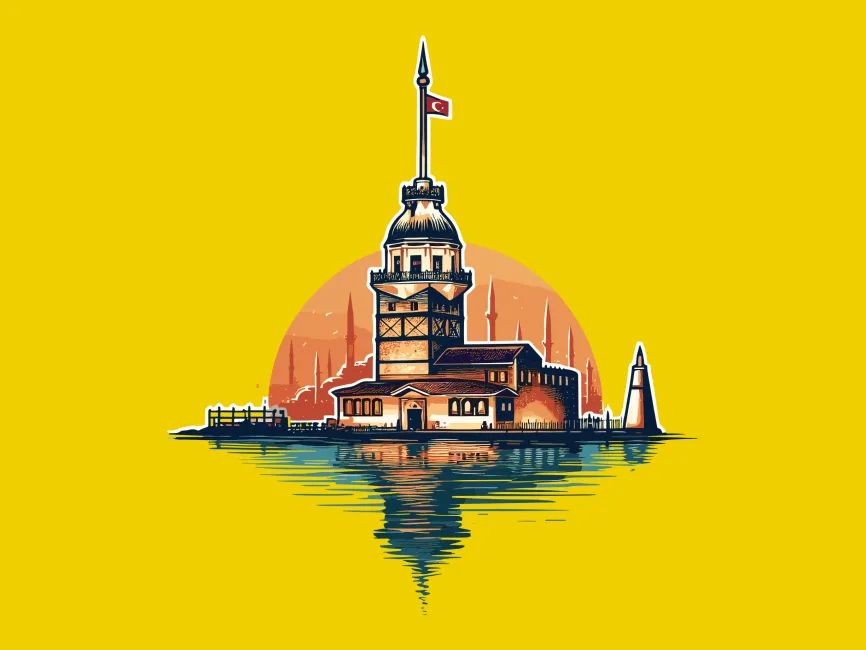 This logo template features a detailed illustration of the Maiden’s Tower (Kız Kulesi) in Istanbul, set against a beautiful sunset backdrop. The warm orange hues behind the tower create a sense of nostalgia, elegance, and cultural depth. The reflection in the water adds realism and sophistication, making it an excellent choice for brands emphasizing heritage, tourism, and maritime aesthetics.