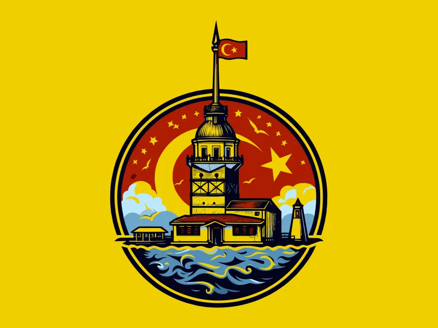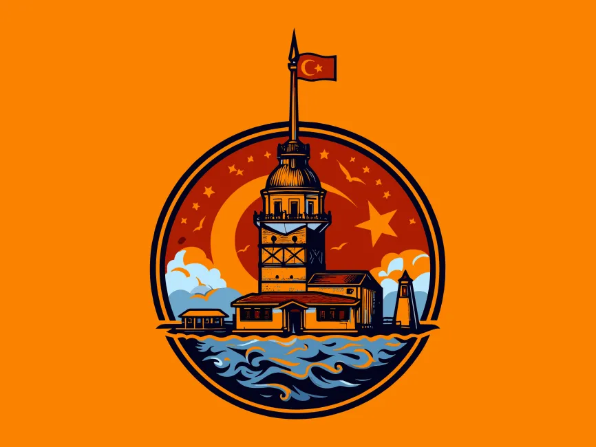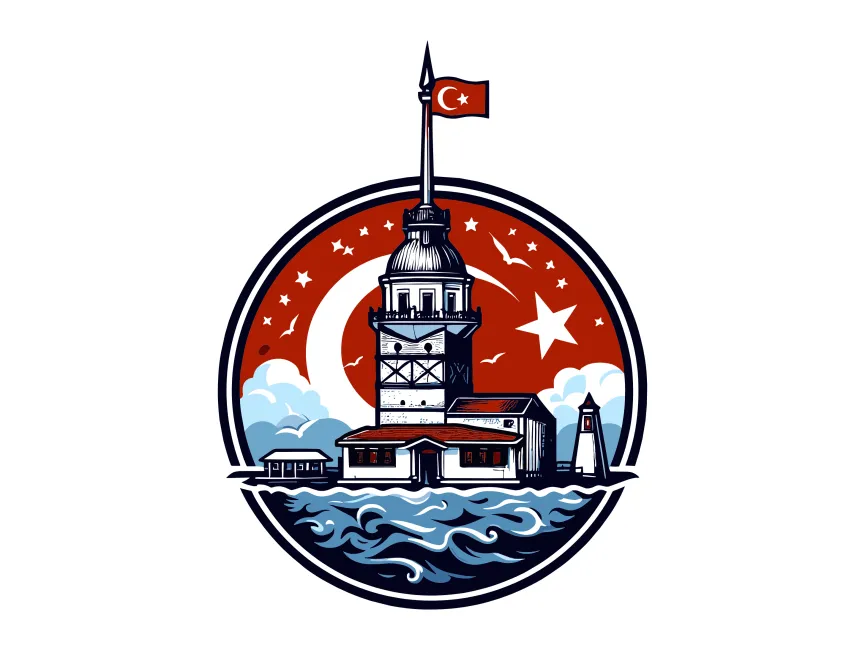 This vector showcases the Maiden’s Tower (Kız Kulesi), one of Istanbul’s most iconic landmarks, set within a circular frame. The design includes a crescent moon and star, symbolizing Turkish heritage and national pride. The detailed illustration with waves and a cityscape adds depth, making it an excellent representation of history, culture, and tourism.