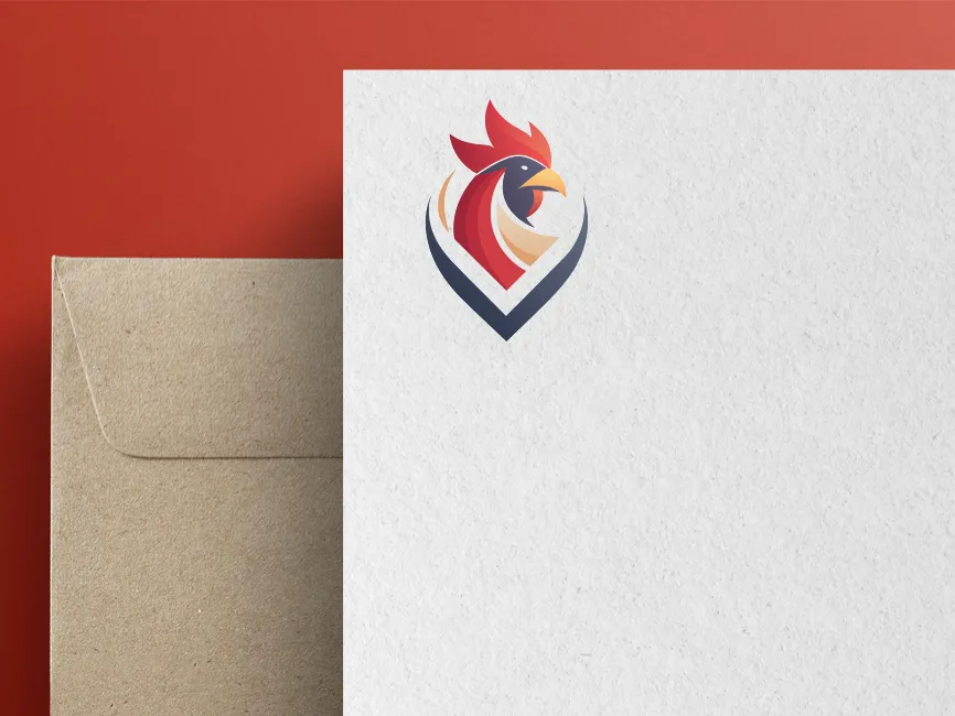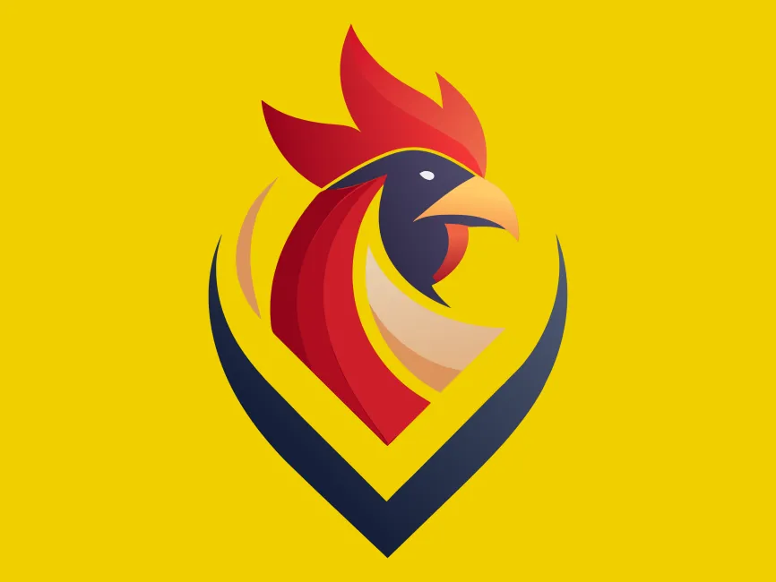 This bold and modern rooster logo features a sleek, dynamic design, combining sharp lines and smooth curves to create a powerful and elegant emblem. The rooster’s head is framed by a V-shaped base, symbolizing victory, leadership, and prestige. The red and gold gradient feathers convey energy and confidence, while the dark navy blue contrast adds a touch of strength and sophistication.