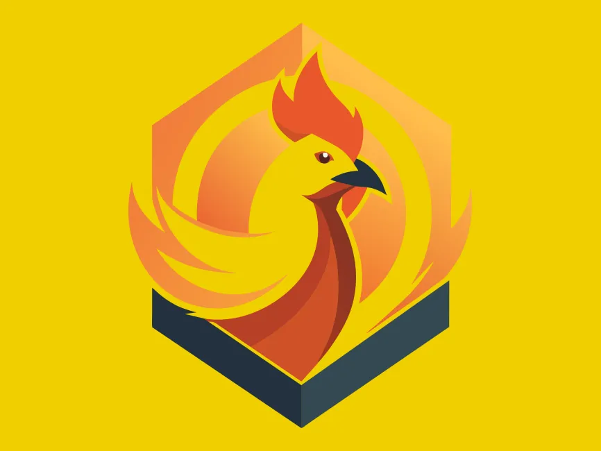 This bold and elegant rooster logo features a sleek, modern design enclosed within a hexagonal frame, symbolizing strength, structure, and balance. The flowing, curved lines of the rooster create a sense of movement and energy, while the warm orange gradient represents passion, confidence, and vitality. The contrasting dark blue base grounds the design, adding a professional and premium touch.