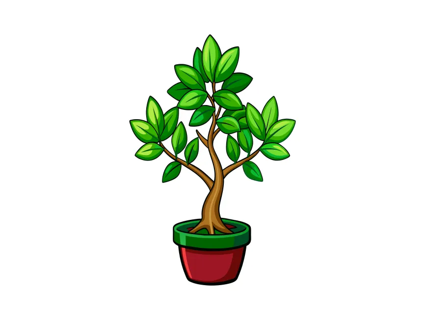 This bonsai tree vector illustration showcases a slim, twisting trunk supporting lush green foliage in a well-balanced composition. The leaves are bright and vibrant, creating a fresh, lively aesthetic, while the trunk's organic curves add an artistic touch. The red and green ceramic pot enhances the visual appeal, offering a striking contrast to the earthy tones of the tree.