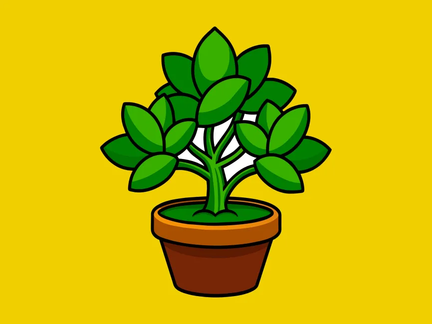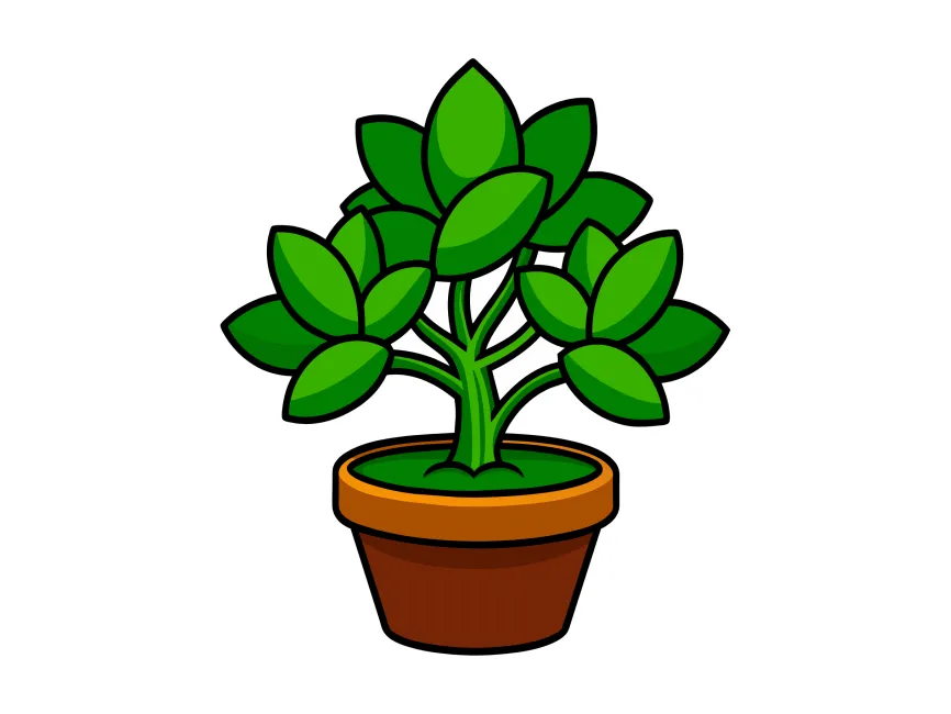 This vector illustration features a stylized potted plant with bold, rounded green leaves arranged in a symmetrical pattern. The thick black outlines give the design a modern, cartoon-like appearance, making it stand out in both digital and print applications. The terracotta pot, with warm earthy tones, provides a natural contrast to the bright green foliage, enhancing its organic look.