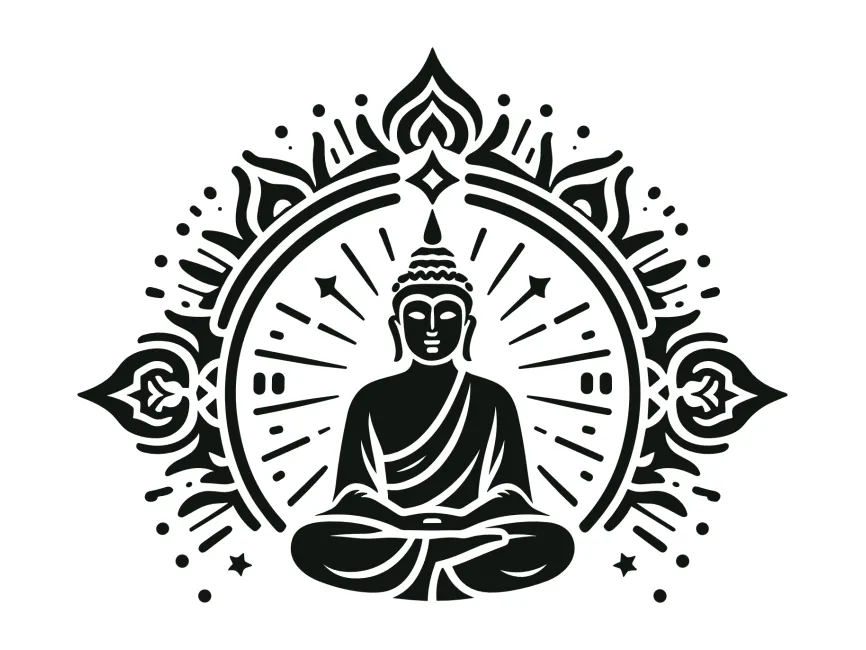 At the center, the Buddha sits in the traditional lotus pose with a calm expression and balanced posture, representing inner peace and enlightenment. A circular arc surrounds the figure like a halo, from which symmetrical rays, stars, lotus motifs, and geometric shapes radiate outward. The design blends organic forms with sharp accents, creating a unified sense of energy and stillness.