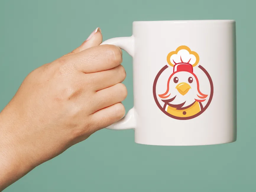 This logo template features a stylized chicken chef in a minimalist and modern design. The bold lines, smooth curves, and simplified details make it a versatile and recognizable branding element. The chicken wears a red chef's hat with a cloud-like top, symbolizing culinary expertise, while its warm color palette of red, yellow, and brown conveys passion, quality, and trust. The circular frame surrounding the design enhances its professional appeal, making it perfect for a range of food-related businesses.
