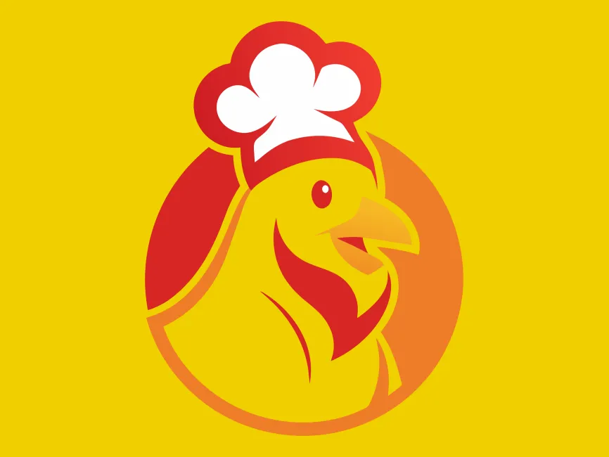 - Elements: The rooster's head is dynamically illustrated with smooth curves, a bold beak, and a prominent chef’s hat, emphasizing the culinary theme.
