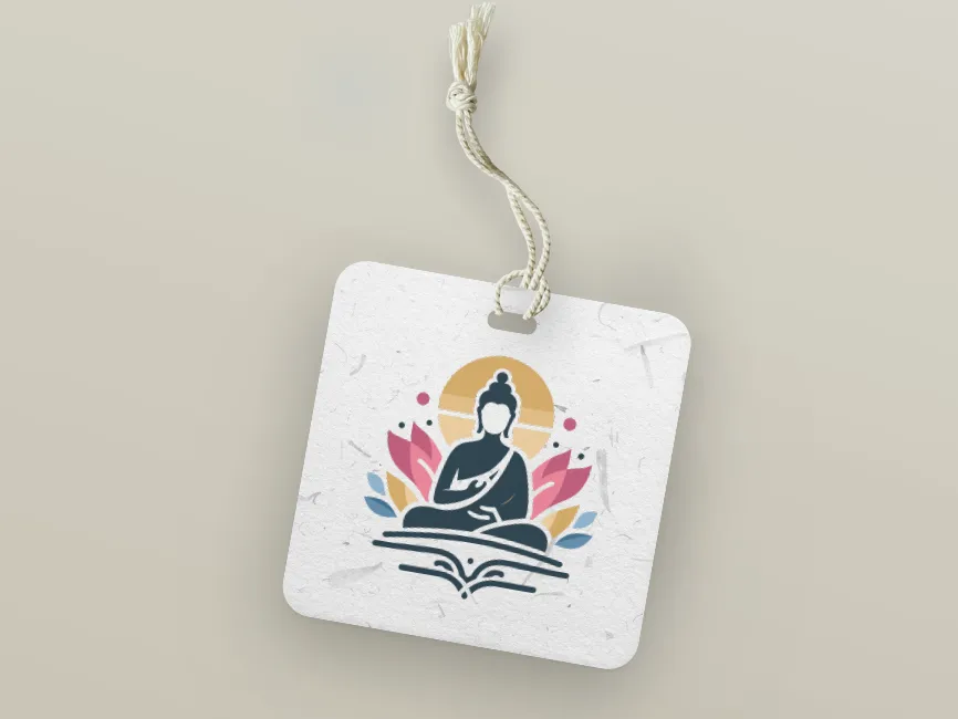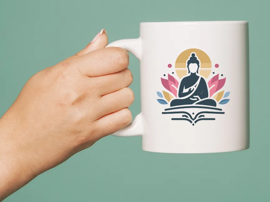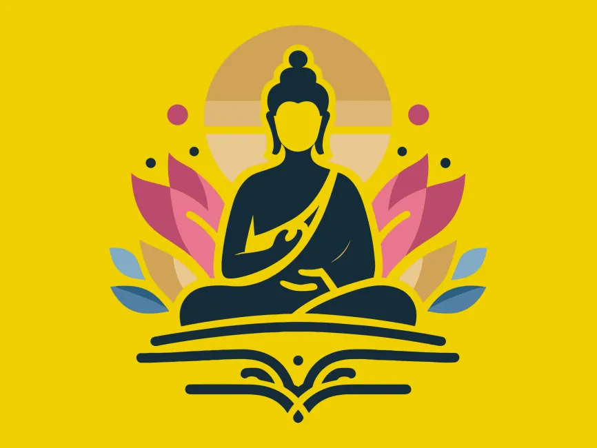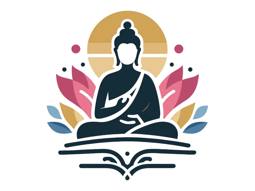 At the heart of the design is a simplified Buddha figure in Vitarka Mudra, the hand gesture symbolizing teaching, discussion, and intellectual wisdom. The faceless depiction enhances universality — allowing the viewer to project themselves into the image. Behind the figure, a segmented golden circle represents a rising sun or full moon, evoking awakening, clarity, and divine presence. Lotus petals in soft pink and gold emerge outward, symbolizing growth, rebirth, and peace. Blue and light gold leaves add visual balance and natural harmony to the composition. Beneath the figure, flowing black lines mimic an open book, scroll, or stylized lotus base — suggesting knowledge, grounding, and sacred storytelling.
