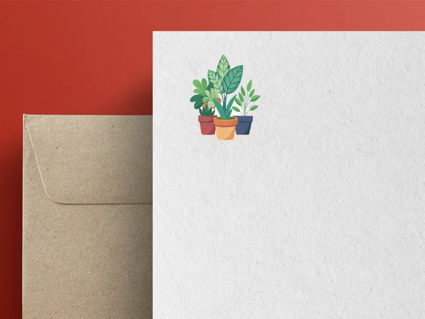 This vector design presents a stylish arrangement of potted plants, featuring a mix of lush green foliage with earthy terracotta, deep blue, and red pots. The illustration style is elegant and modern, making it ideal for nature-inspired branding, eco-friendly projects, interior design graphics, and botanical-themed websites.