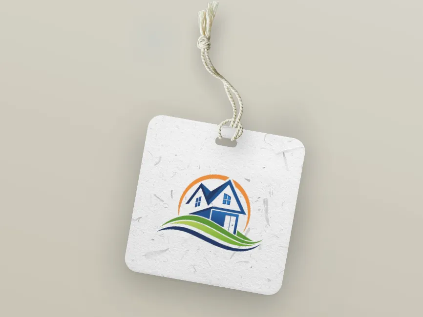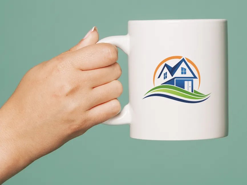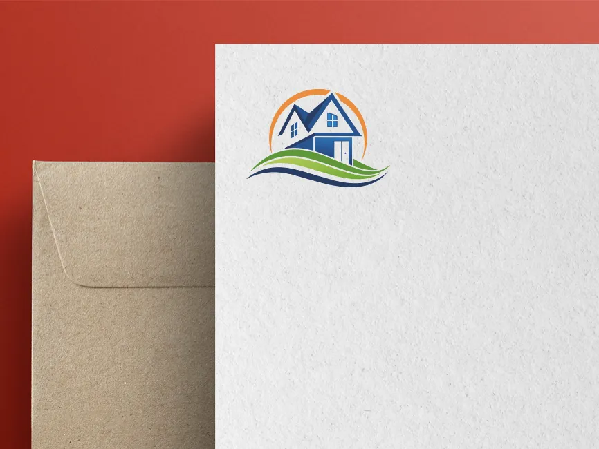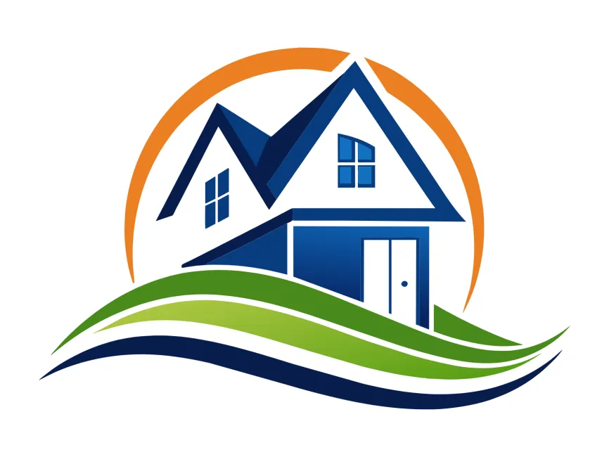 This real estate logo features a stylized house with dynamic landscape elements, creating a professional and inviting brand identity. The blue house with multiple windows and a pitched roof symbolizes homeownership, security, and reliability, while the green waves below represent land, sustainability, and eco-friendly housing. The orange arc in the background suggests warmth, growth, and a rising sun, making this logo ideal for real estate agencies, property developers, and environmentally conscious housing projects.